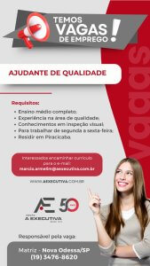 ATENÇÃO: Nunca pague nenhum valor para participar de um processo seletivo. Não compre cursos, apostilas ou serviços que prometam participação em seleção ou contratação para uma vaga. E jamais informe dados bancários, de cartão ou envie cópia de documentos e fotos/selfies por e-mail, WhatsApp, aplicativos de celular ou através de sites que não conheça.