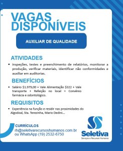 ATENÇÃO: Nunca pague nenhum valor para participar de um processo seletivo. Não compre cursos, apostilas ou serviços que prometam participação em seleção ou contratação para uma vaga. E jamais informe dados bancários, de cartão ou envie cópia de documentos e fotos/selfies por e-mail, WhatsApp, aplicativos de celular ou através de sites que não conheça.