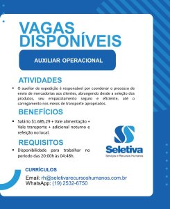 ATENÇÃO: Nunca pague nenhum valor para participar de um processo seletivo. Não compre cursos, apostilas ou serviços que prometam participação em seleção ou contratação para uma vaga. E jamais informe dados bancários, de cartão ou envie cópia de documentos e fotos/selfies por e-mail, WhatsApp, aplicativos de celular ou através de sites que não conheça.