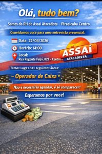ATENÇÃO: Nunca pague nenhum valor para participar de um processo seletivo. Não compre cursos, apostilas ou serviços que prometam participação em seleção ou contratação para uma vaga. E jamais informe dados bancários, de cartão ou envie cópia de documentos e fotos/selfies por e-mail, WhatsApp, aplicativos de celular ou através de sites que não conheça.